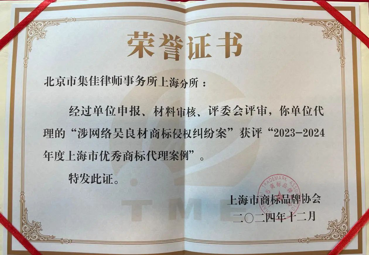 案例一“涉网络吴良材商标侵权纠纷案”被评为上海市优秀商标代理案例